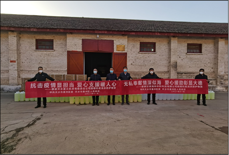 11月8日:甘肅海林中科科技股份有限公司、天水星火機(jī)床有限公司各捐贈(zèng)價(jià)值5萬(wàn)元的醫(yī)用防護(hù)服、隔離臉罩、隔離鞋套、N95口罩、消毒液等防疫物資。